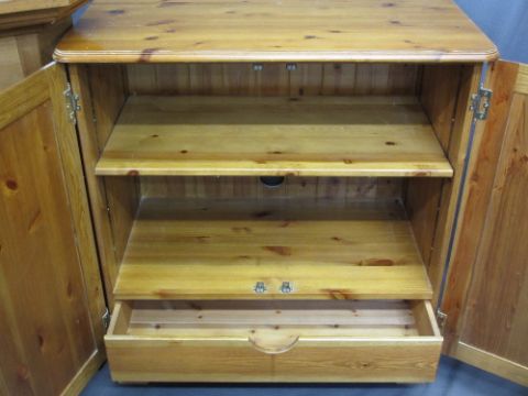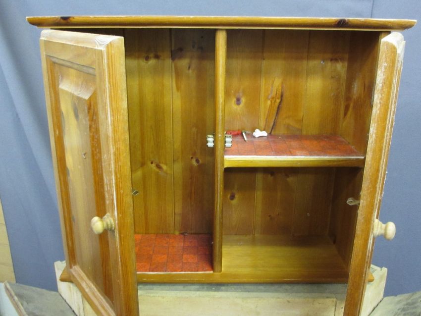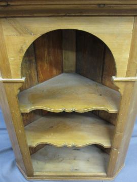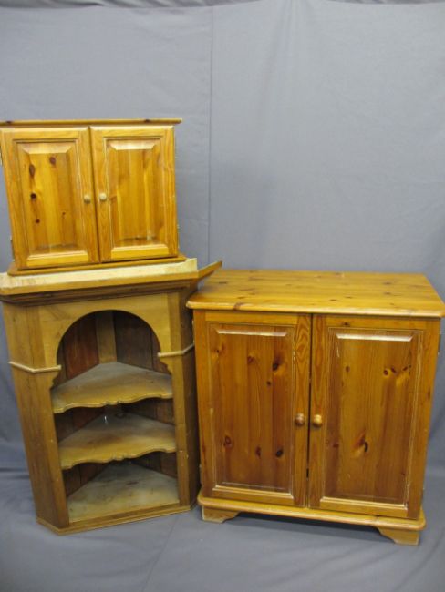 ANTIQUE PINE OPEN CORNER CUPBOARD with shaped shelves, modern pine two door cupboard and a pine hanging cupboard