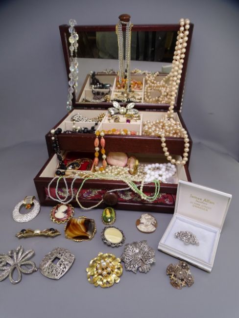 MODERN JEWELLERY BOX & EXCELLENT CONTENTS including 9ct opal, sapphire and paste set rings, a pendant in the form of a ski dated 1982, fine gold link necklace, silver and enamel brooches, stick pins, bead necklaces ETC