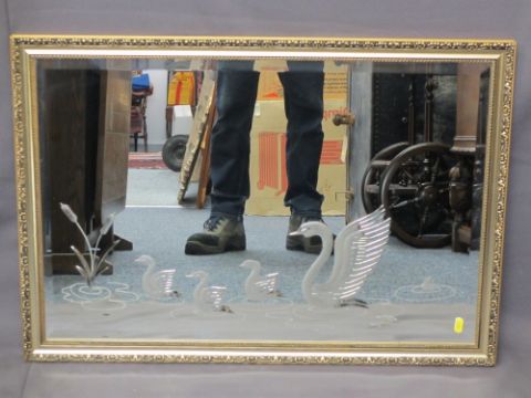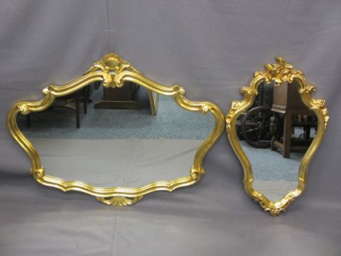 THREE GILT FRAMED WALL MIRRORS, two being Rococo style, the other etched with swans, various measurements