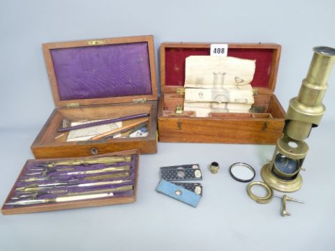 MAHOGANY CASED BRASS FIELD MICROSCOPE with slides and a cased set of drawing instruments