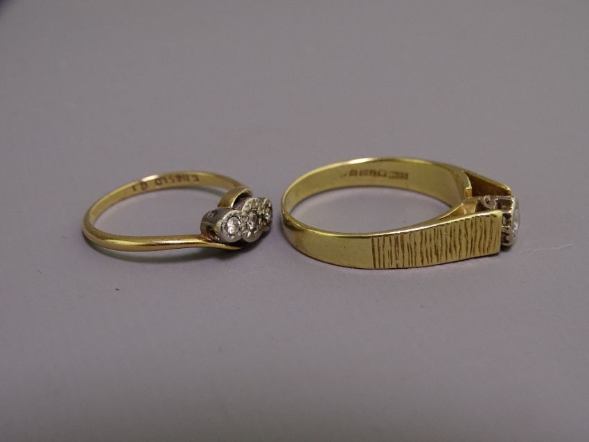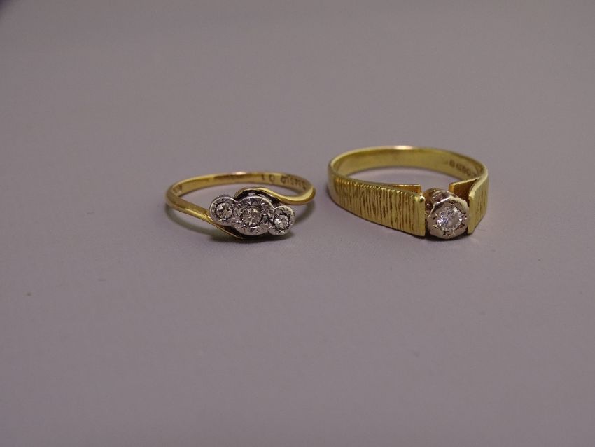 TWO 18CT GOLD DIAMOND SET DRESS RINGS including a solitaire and illusion setting with ribbed shoulders, size P and a three stone in platinum mount mid K-L, 6.2grms gross