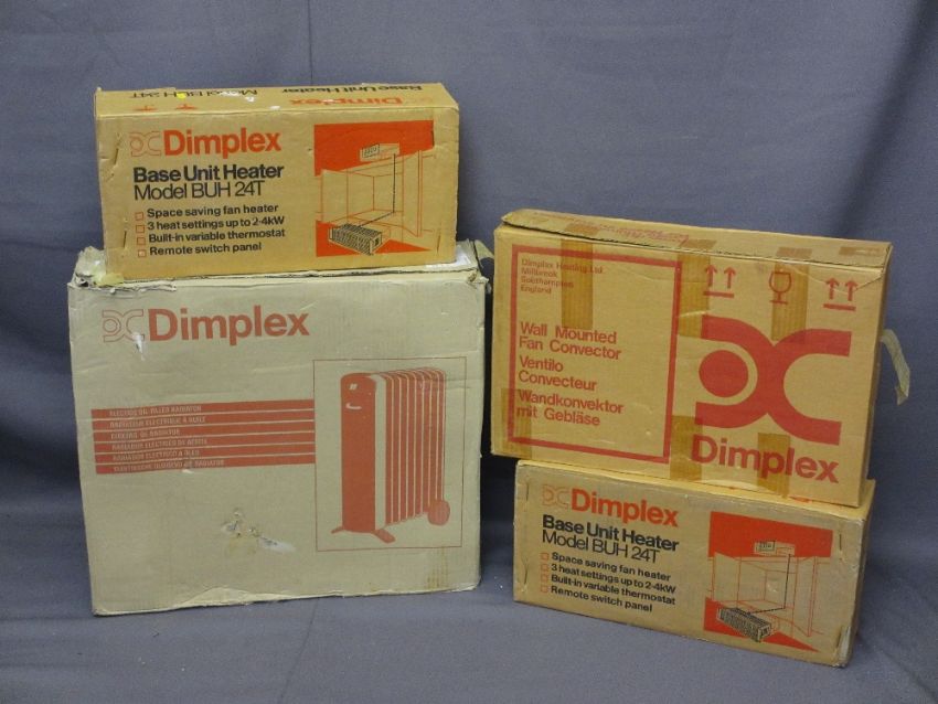 BOXED DIMPLEX OIL FILLED RADIATOR and three electrical wall heaters E/T