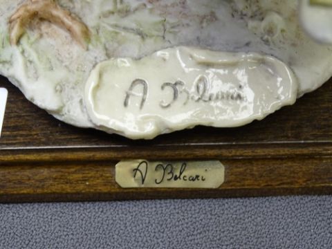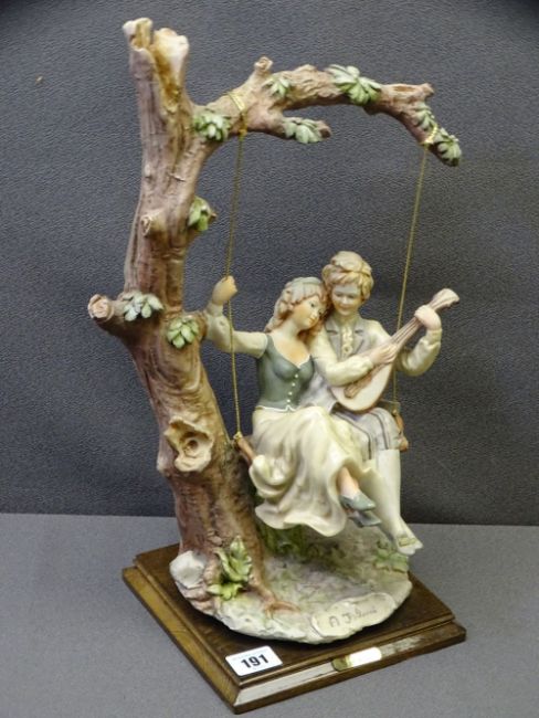 A BELCARI PARIAN FIGURE OF COUPLE ON A SWING on a wooden plinth