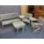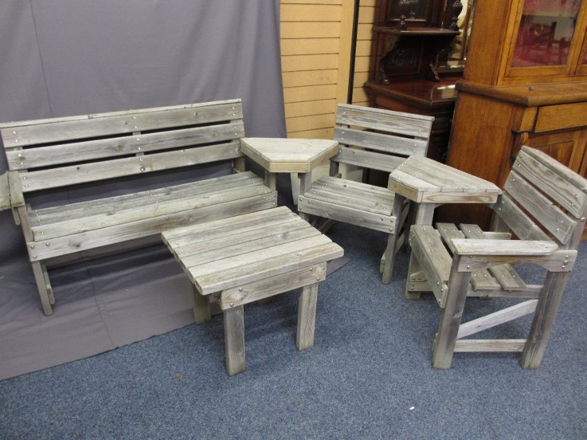 SIX PIECE RUSTIC GARDEN FURNITURE SET consisting of bench, two armchairs, table and corner slot-on tables, various measurements