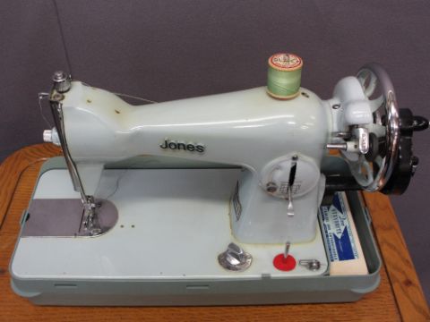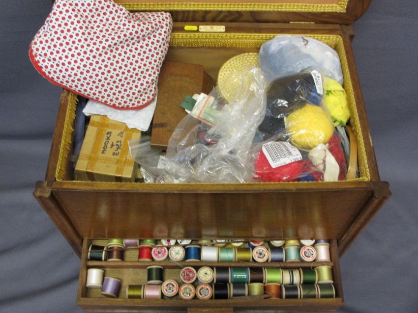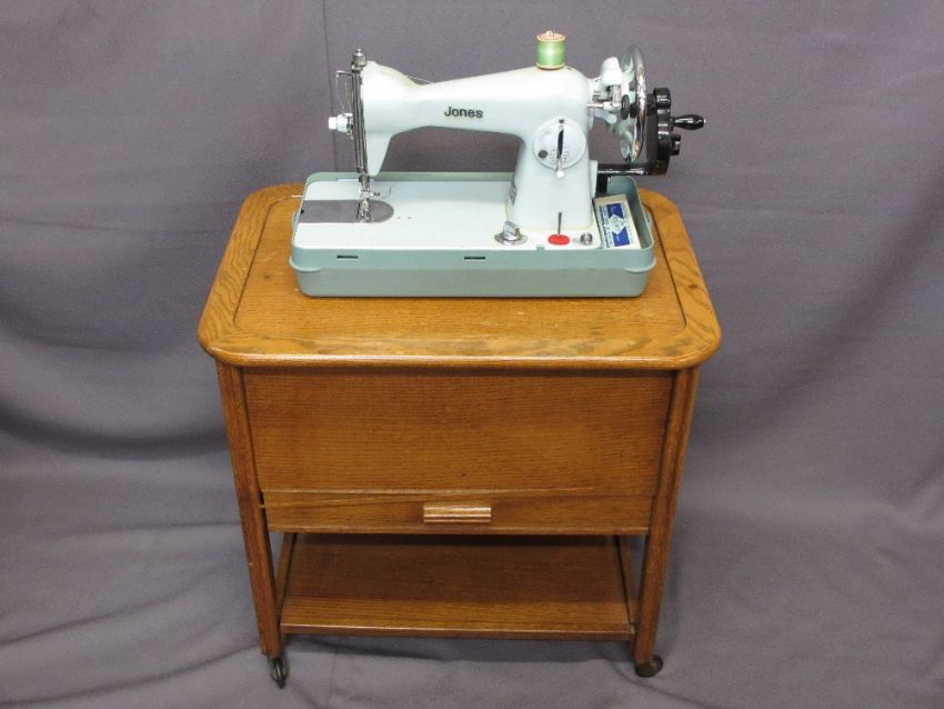 JONES DELUXE HAND CRANK SEWING MACHINE with an oak needlework/sewing box trolley and contents