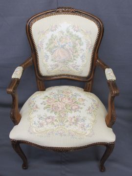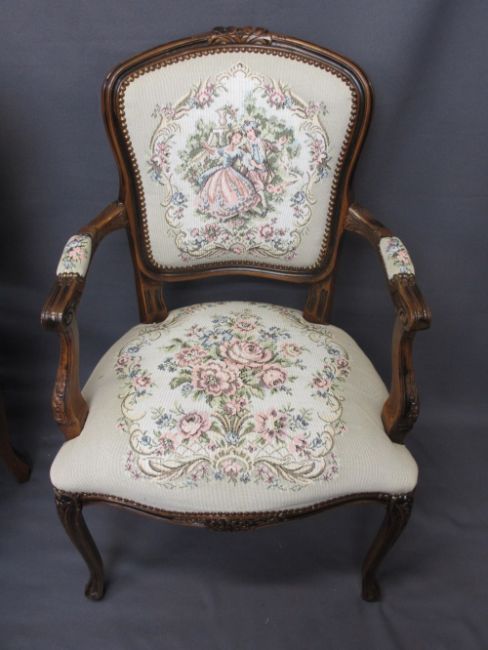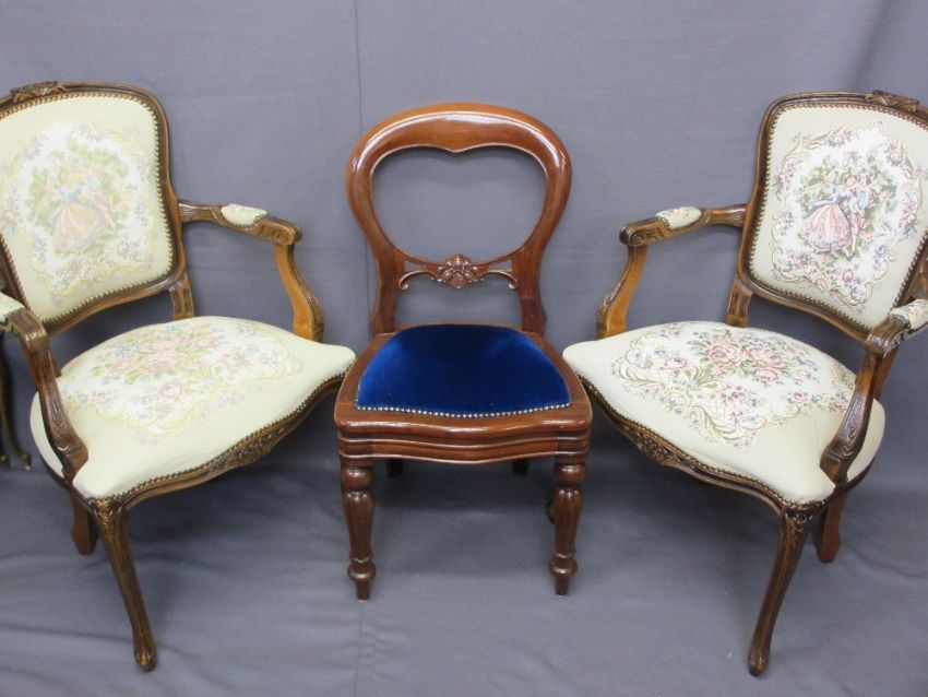 FRENCH STYLE TAPESTRY SEATED ARMCHAIRS, A PAIR, and a reproduction mahogany balloon back side chair, various measurements