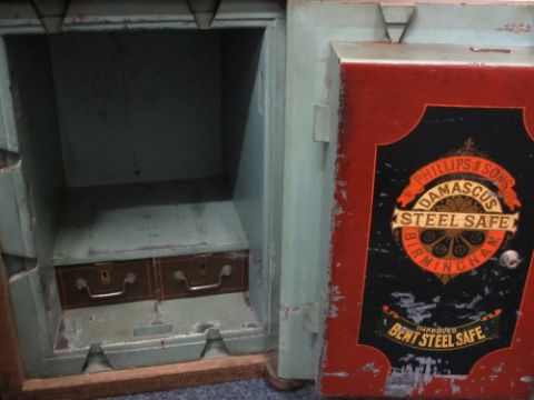 PHILLIPS & SON, BIRMINGHAM, vintage cast iron safe with key, 66cms H, 51cms W, 57cms D