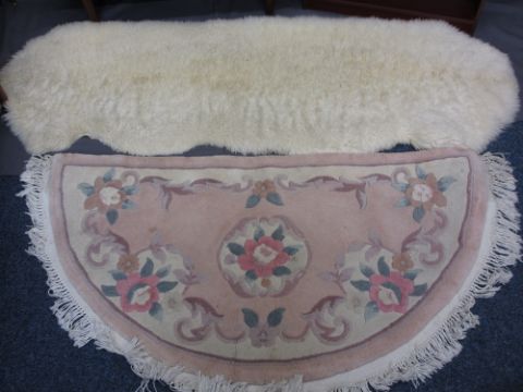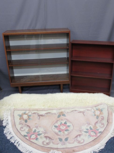 TWO MODERN MAHOGANY EFFECT BOOKCASES, a sheepskin rug and one other
