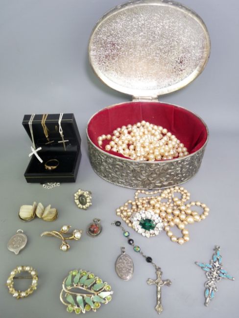 WHITE METAL LIDDED JEWELLERY BOX & CONTENTS including 9ct gold and sterling silver items