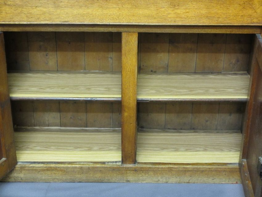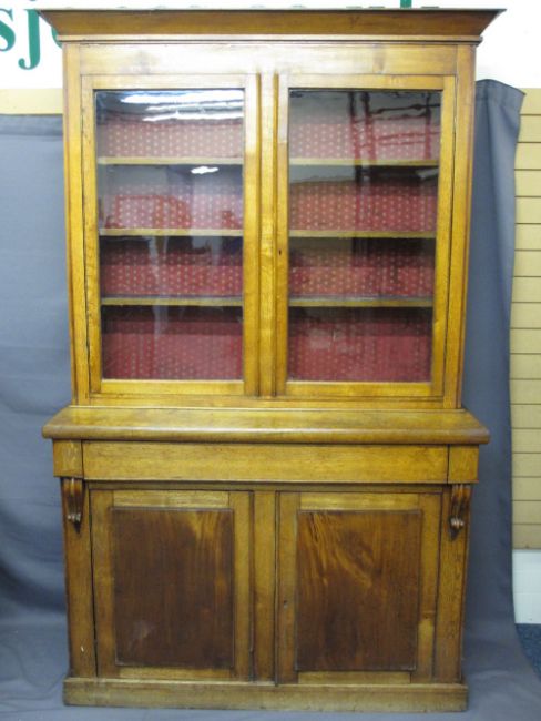 VICTORIAN OAK & MAHOGANY CWPWRDD GWYDIR, twin upper glazed doors with interior shelving, the base with single frieze drawer and two cupboard doors with applied mahogany panels and carved corbel detail on a plinth base, 232cms H, 145cms max W, 47.5cms D