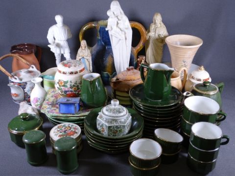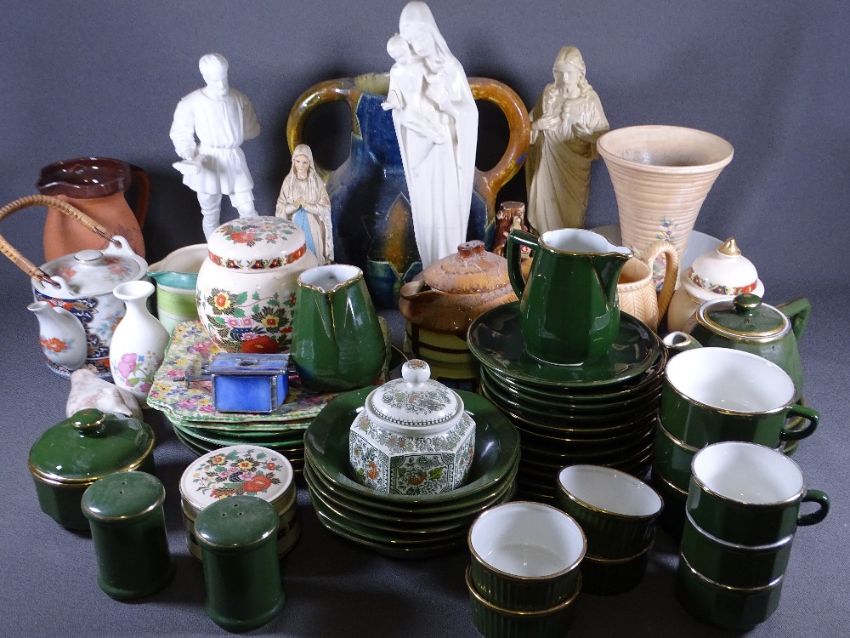 RELIGIOUS FIGURES, mixed china and stoneware including interesting two-handled jug ETC