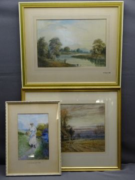 THREE VICTORIAN WATERCOLOURS - DAVID WOODLOCK - young girl on a riverside path, 24.5 x 16.5cms, HUGH NISBETT - country cottage with farmer and livestock to the foreground, 26.5 x 36.5cms and H MAGENIS - fisherman casting near the River Wear, 25 x 36.5cms