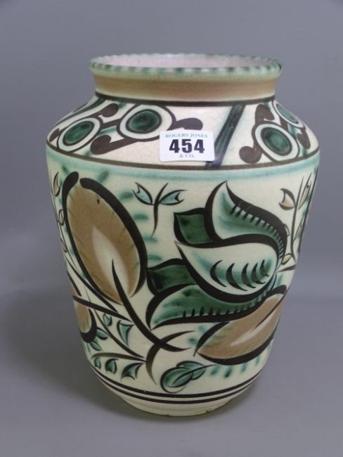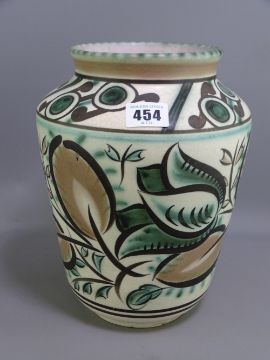 CARTER STABLER ADAMS POOLE POTTERY VASE, 25cms H, hand painted with stylized flowers, impressed factory stamp to a pink base (crazing, small chip to glaze at the foot)