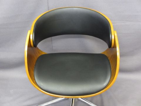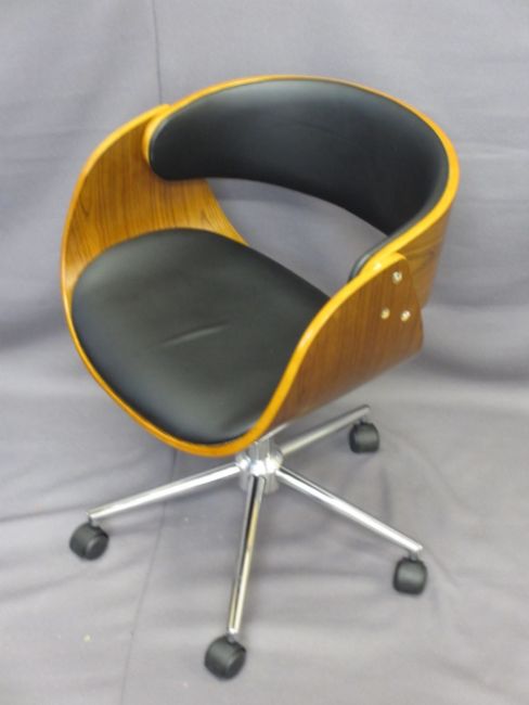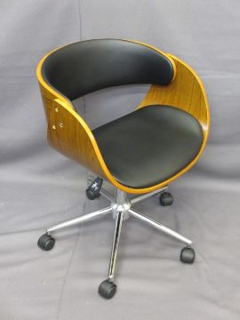 ULTRA STYLISH MODERN SWIVEL OFFICE CHAIR, teak bentwood and black leather effect seat and back on a chrome plated base, 73.5cms H, 51.5cms W