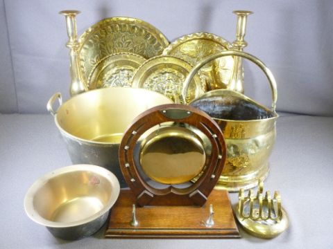 BRASS CANDLESTICKS, a good pair, 41cms H, brass helmet coal scuttle, horseshoe shaped brass gong, French Gras bayonet (A/F) ETC