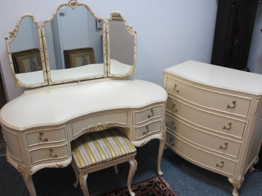 FRENCH STYLE PAINTED PART BEDROOM SUITE of triple mirror kidney shaped dressing table and stool and four drawer serpentine front chest, various measurements