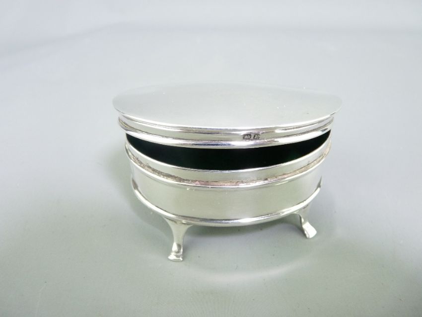 LIDDED OVAL TRINKET BOX, Birmingham 1929, maker Clark and Sewell, hinged lid and velvet interior on four raised feet, 6.5cms across