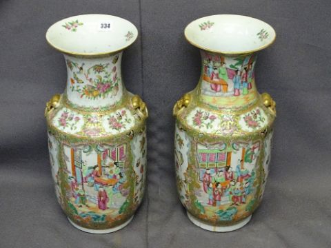 19TH CENTURY CANTON FAMILLE ROSE DECORATED VASES, a pair, with dragon and hoho bird framed panels of groups of people, fruit, flowers, birds and butterflies with gilt decorated mask and ring handles, 45cm heights