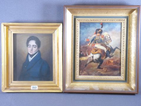 UNSIGNED GOUACHE PORTRAIT OF A PERIOD GENTLEMAN, 23 x 19cms and an oilograph of a soldier on horseback