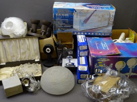 BOXED HOUSEHOLD LIGHTING and a small glass chandelier with facet cut drops