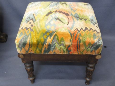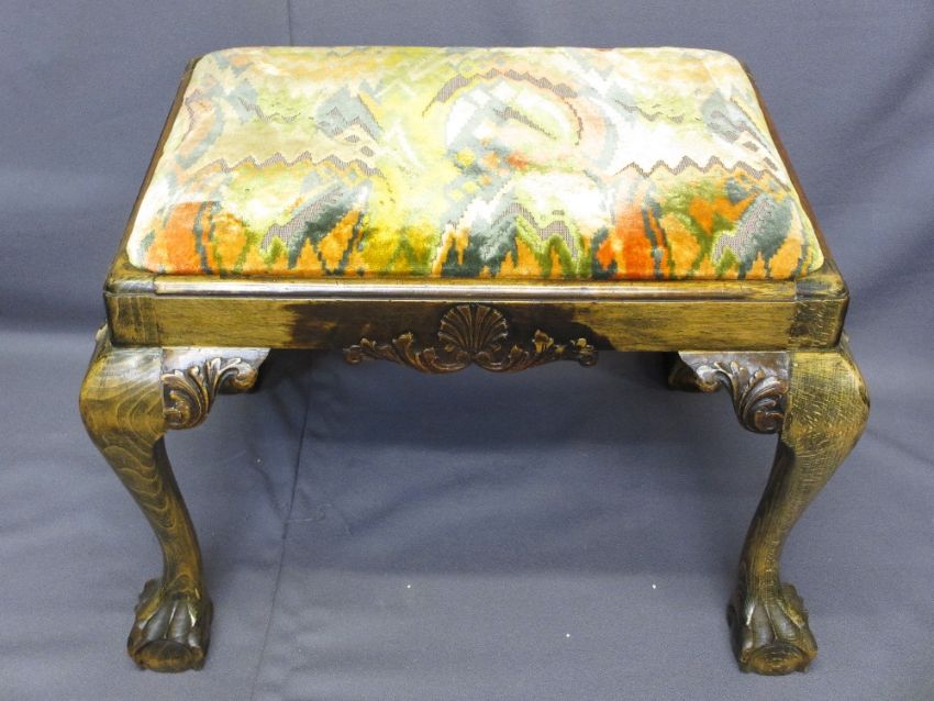 TWO ANTIQUE STYLE FOOTSTOOLS including a ball and claw foot example, 46cms H, 56cms W, 50cms D