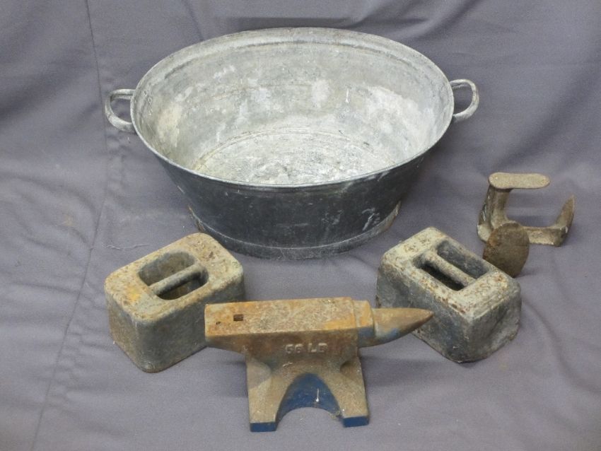 GALVANIZED TIN TUB, a 56lb Anvil and other cast iron items