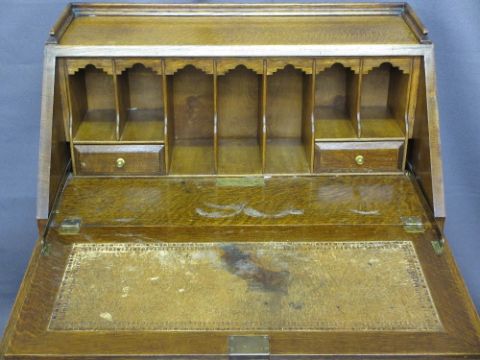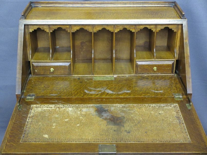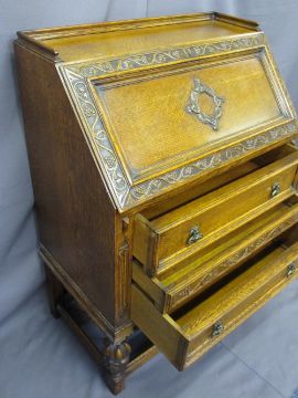 CIRCA 1930 CARVED OAK BUREAU having grape and vine detail on pineapple type supports with interior presentation plaque, 111.5cms H, 78cms W, 48cms D