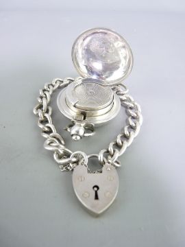 EDWARDIAN CHASE DECORATED SILVER SOVEREIGN CASE, Birmingham 1909, maker Joseph Gloster Ltd and a silver padlock clasp bracelet with heavy link chain (chain unmarked), 40grms gross