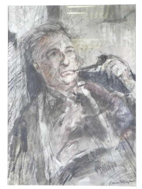 WILLIAM SELWYN watercolour - head and shoulders portrait of a pipe smoking Moss Williams, artist and fried of William Selwyn, 44 x 31cms