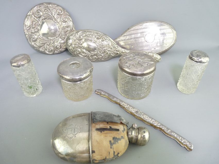 SILVER TOPPED DRESSING TABLE BOTTLES, hallmarked 'Hip Flask' (AF) and a white metal dressing table hand mirror and other items