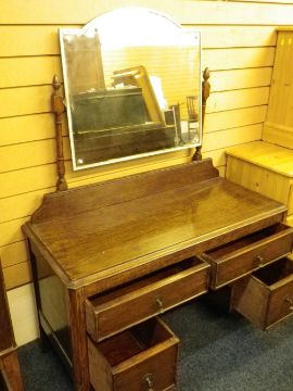 VINTAGE OAK THREE PIECE BEDROOM SUITE of single door mirrored wardrobe, 192cms H, 117cms W, 45.5cms D, mirrored dressing table and three drawer railback chest