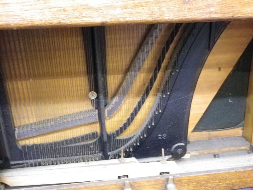 COMPACT FORREST & SON SHREWSBURY oak cased upright piano with box seat music sheet stool, 102cms H, 96cms W, 53cms D the piano
