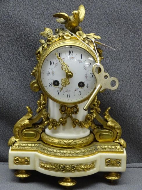 GILT BRASS & MARBLE FRENCH DRUM CASED MANTEL CLOCK, floral decorated white enamel dial set with Arabic numerals before a pendulum driven movement, stamped 'AD Mougin, numbered 64 and 275' with bell strike chime (key present, pendulum missing), 29cms H, 19cms W, 10cms approx drum depth