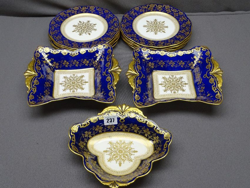 AYNSLEY PORTLAND DESERT SERVICE, 13 pieces in Cobalt Blue and gilt to include a pair of 25cms across twin-handled dishes, a 23.5cms lobed dish and 10 x 21.5cms diameter plates, (lobed dish with restorations, surface scratches, crazing and light staining apparent to the plates, all but four have dull dings)