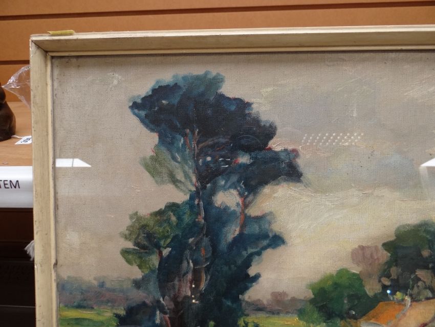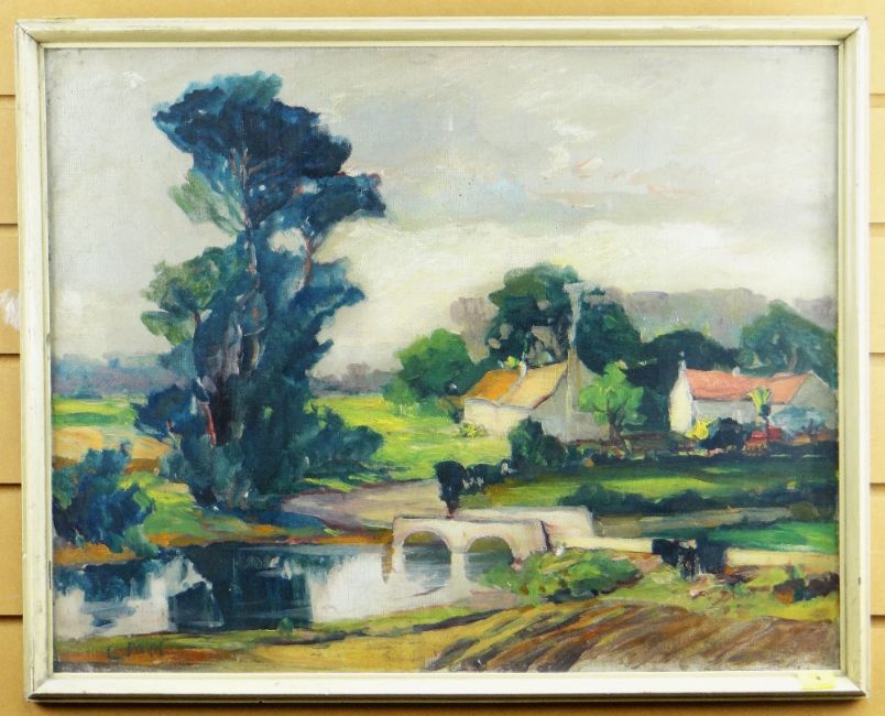 LETITIA MARION HAMILTON (Irish 1878 - 1964) oil believed on board behind glass - landscape with terracotta roofed buildings, bridge and tall tree, probably Brittany, signed with initials, 47 x 60cms