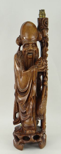 GOOD CARVED BOXWOOD FIGURE OF A CHINESE SCHOLAR standing beside a carved staff with stork and holding a pomegranate, for table lamp use with fitting, 64cms high