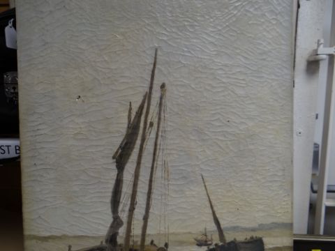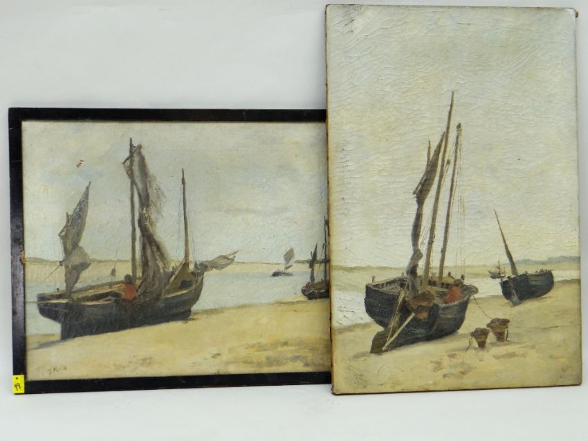 JACOB MARIS (Dutch 1837 - 1899) oils on canvas pair - coastal scenes with beached boats, signed, 38 x 57cms and 59 x 39cms Condition Report: one framed, both with extensive craquelure and other areas of concern