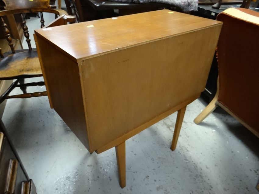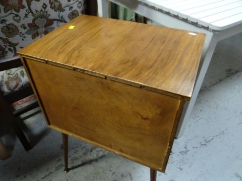 TWO MID-CENTURY RECORD CABINETS ON RAISED LEGSThe larger of the two has lots of surface scratches to the top, also one door does not close properly.The small looks good, little wear, doors slide well.Both are stable and structurally solid.