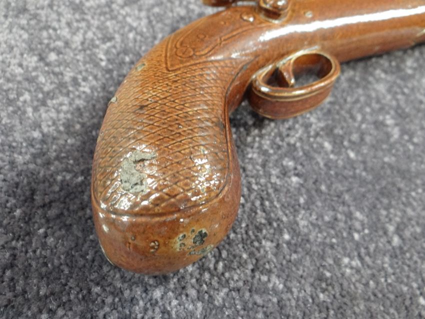 TWO SIMILAR DOULTON & WATTS LAMBETH STONEWARE DUELING PISTOL SPIRIT FLASKSThere is slight damage to the ends of the guns and there are a few small chips around the handles.