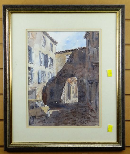 DAVID TRESS watercolour - continental street scene with French car, signed and dated 1987, 36.5 x 27cms