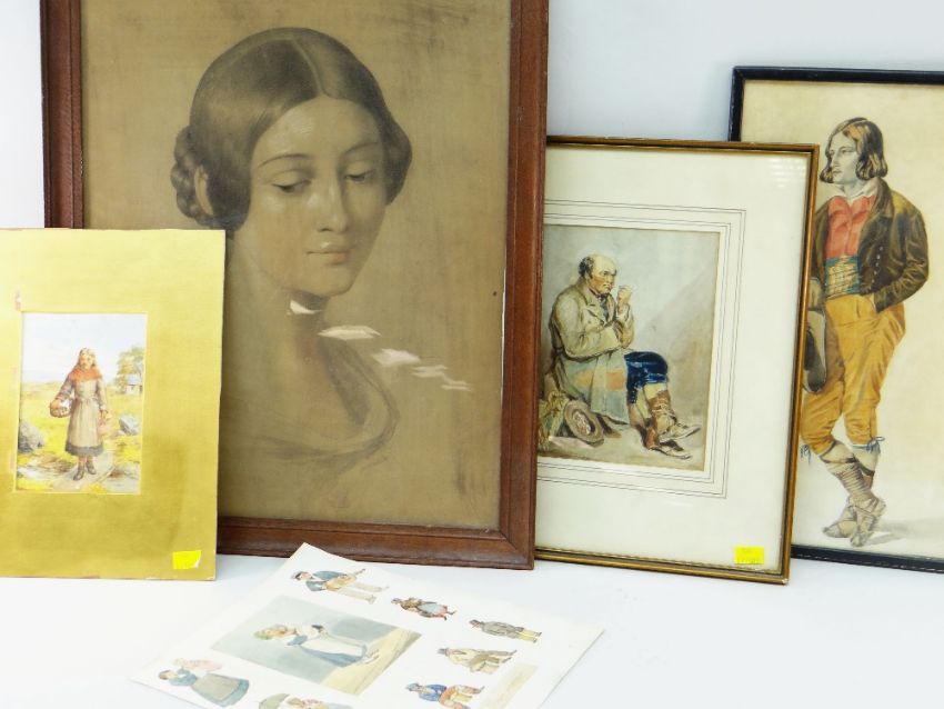 R T MINSHULL / POSSIBLY WILLIAM HENRY HUNT / ET AL various portraits, mainly watercolours, including inscribed 'Jane Eyre', unframed cut-outs of figures on to single page ETC (5 x)