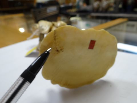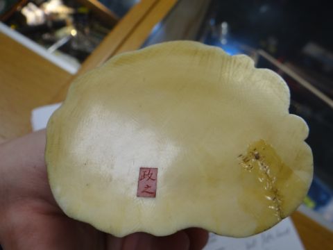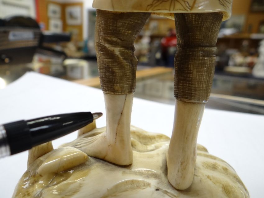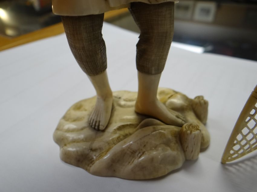 MEIJI PERIOD IVORY OKIMONO SECTIONAL FIGURE OF A FISHERMAN WITH NET, on naturalistic base, red signature mark to baserestoration to base and hairline cracks on back