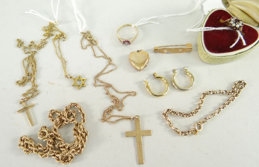 ASSORTED SMALL GOLD JEWELLERY ITEMS including two dress rings, fine necklaces with pendants ETC