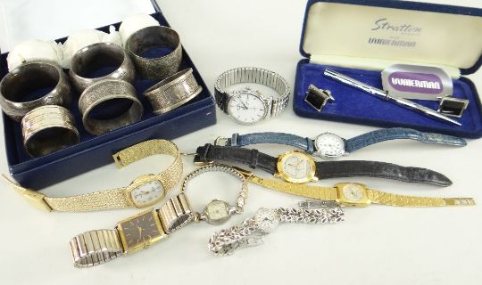 ASSORTED SMALL ITEMS including napkin rings, some silver, wristwatches and a cased Waterman pen and cufflink set