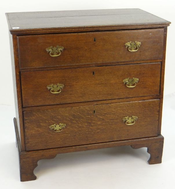 18TH CENTURY OAK THREE-DRAWER CHEST with moulded top and bracket feet, 81 x 46 x 83cms