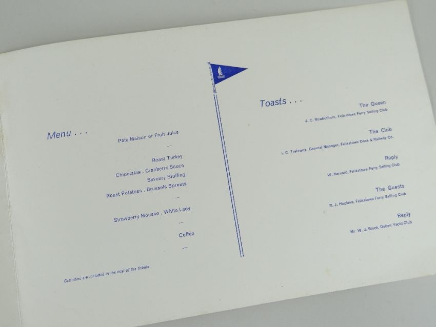GILES - A SIGNED MENU FOR THE FELIXSTOWE FERRY SAILING CLUB, dated November 22nd 1968, the illustrated cover inscribed 'To Tracy with love from Giles', the vendor adds 'Carl was blind in one eye and deaf in his right ear which is why I always sat or stood to his left and stood thus in a urinal he told me that his first reaction to the new drink drive laws was to switch to shandies but gave up when his natural functions looked like a bubble bath!' 20 x 30cms