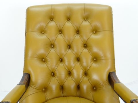 MUSTARD YELLOW LEATHER UPHOLSTERED MAHOGANY LIBRARY ARM CHAIR, button back and loose squab seat, turned legs, casters (modern reproduction)