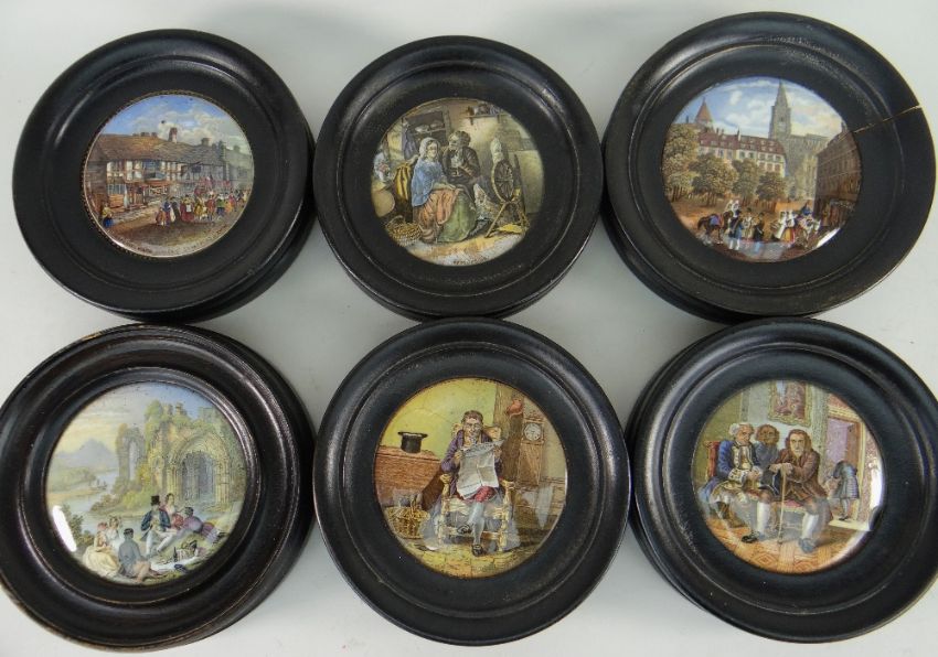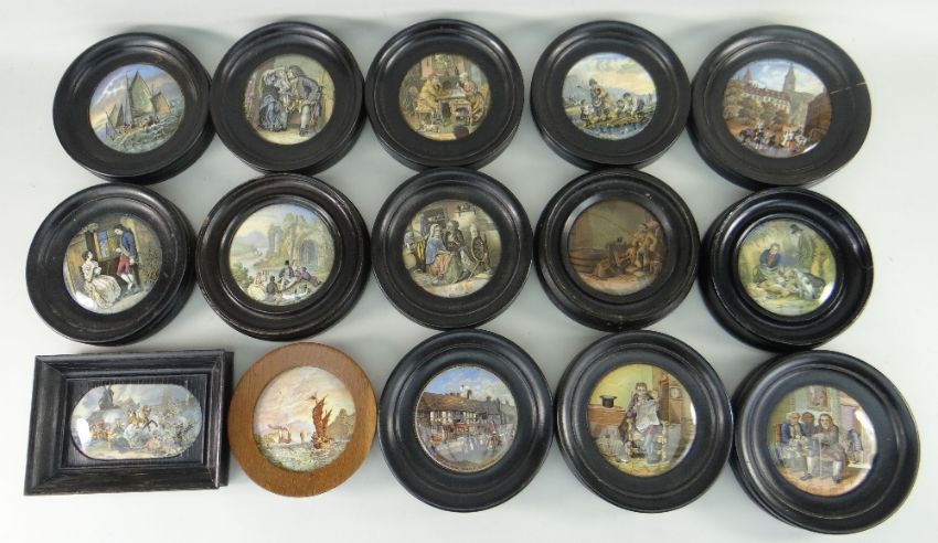 ASSORTED PRATTWARE POT LIDS IN EBONIZED FRAMES (some with damage) (15)