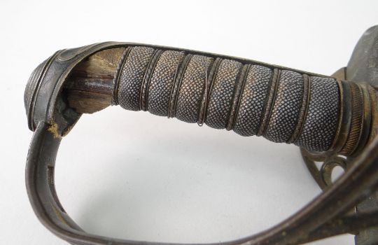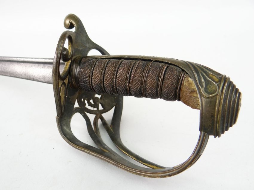 1822 PATTERN INFANTRY OFFICER'S SWORD 77.5cms curved pipe-back fullered blade which gives this sword a date between 1822 and 1845, hilt crowned IV cipher, wire-bound shagreen grip, guard still has return hinge in place and working, 91cms long