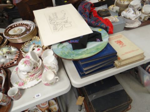 ASSORTED CERAMICS & OTHER ITEMS on the table and beneath the table including an unsigned Ceri Richards print